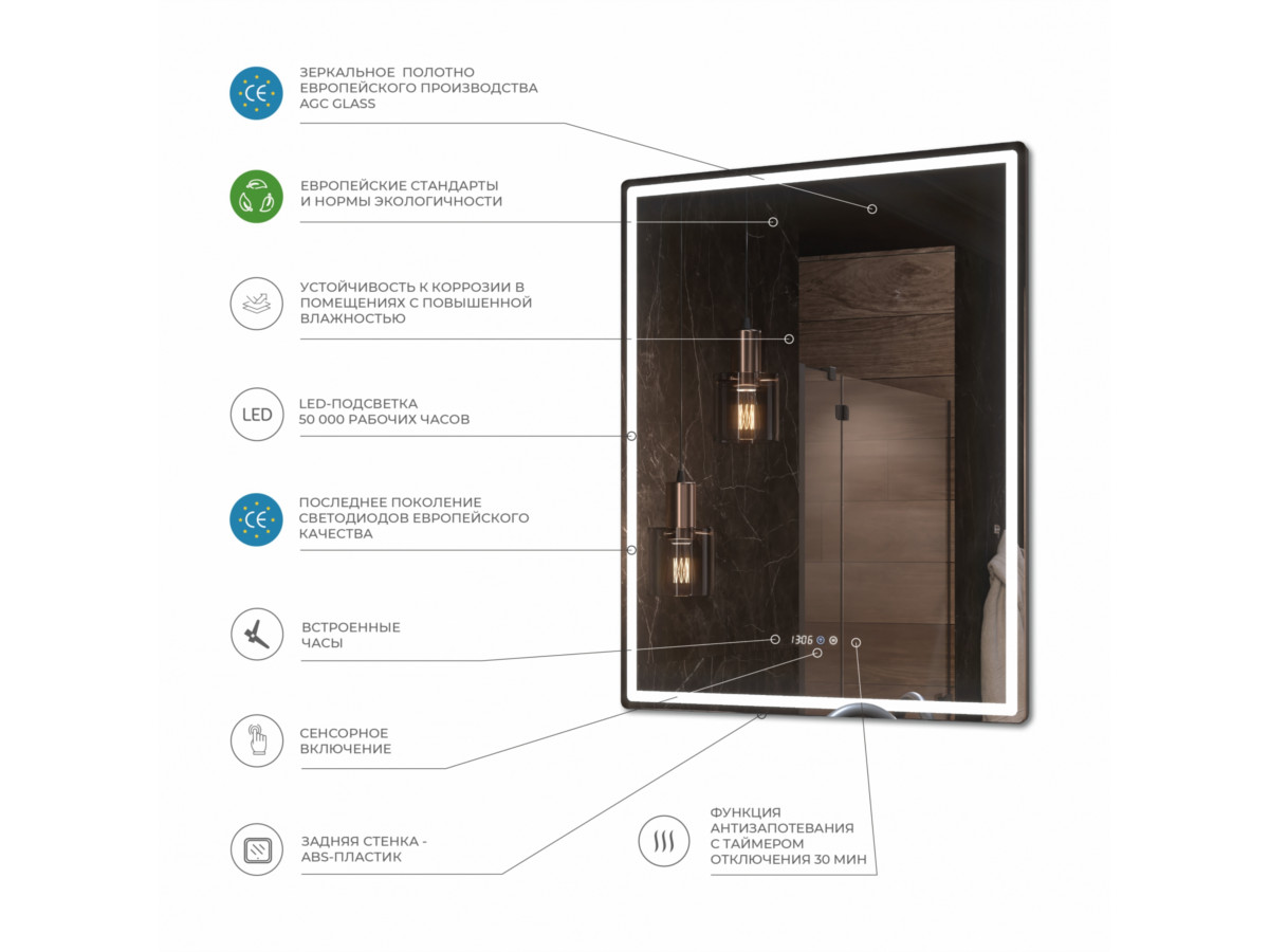светодиодная подсветка по периметру; сенсорное управление; встроенные часы;функция антизапотевания с таймером отключения