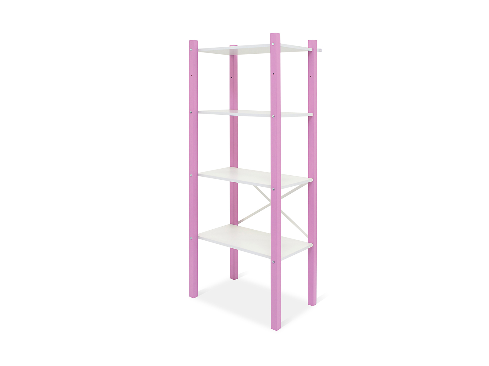 Стеллаж стоит на 4ех ножках. Для устойчивости конструкцию детского стеллажа можно прикрепить к стене с помощью специального уголка, который идет в комплекте. Стеллаж сконструирован так, что его можно использовать в двух вариантах – с четырьмя полками или с вешалом и одной полкой. Все необходимое для двух вариантов сборки стеллажа идет в комплекте.