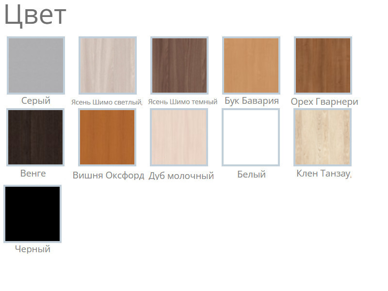 Цвета: Белый, Серый, Черный, Дуб молочный, Клен Танзау, Бук Бавария Светлый, Вишня Оксфорд, Орех Гварнери, Венге Линум, Ясень Шимо светлый, Ясень Шимо темный