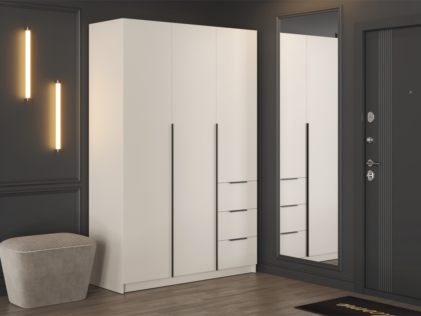 - Две левых створки и фасады ящиков имеют ручку – цвет чёрный, материал – пластик.