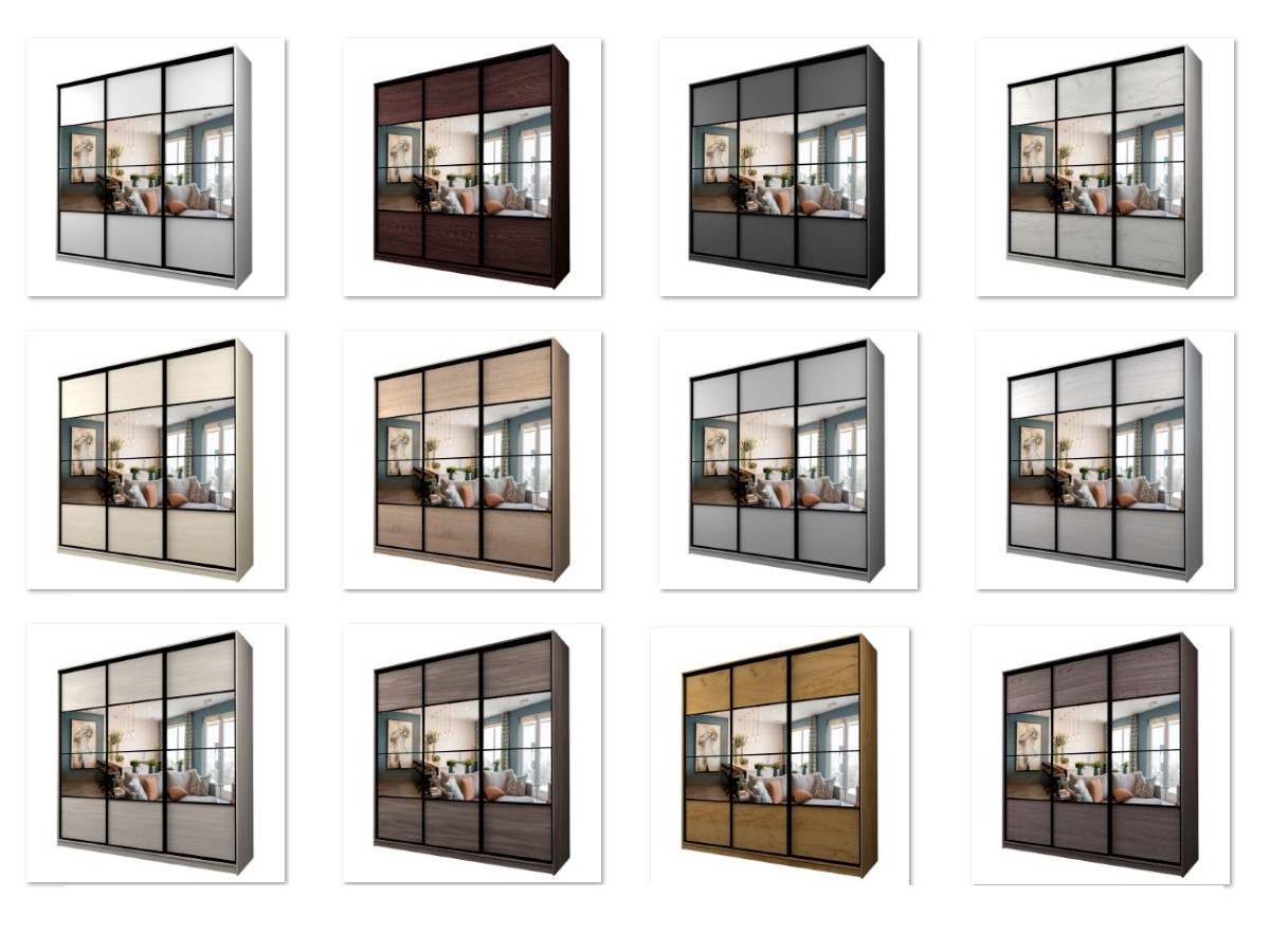 - 3 двери верхняя и нижняя вставка – ДСП 10 мм, две центральные – зеркало серебро.