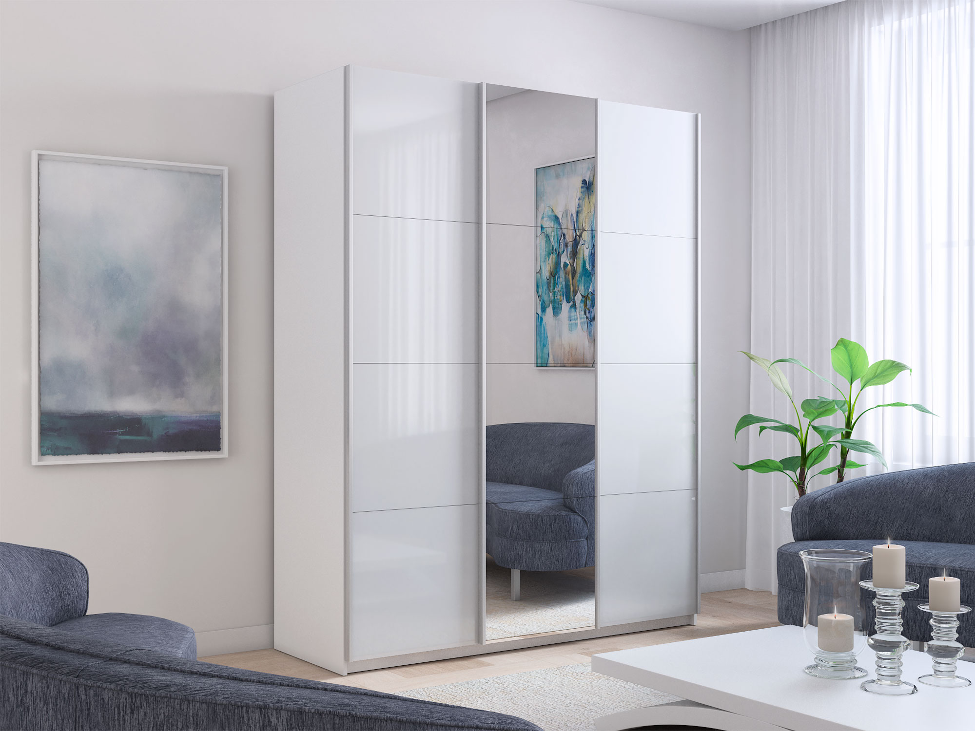 - Шкаф-купе Прайм 3-х дверный 2100 два Стекла Белые/Зеркало Белый Снег