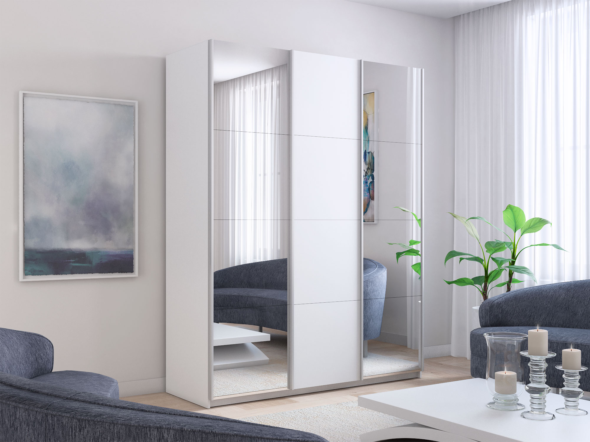 - Шкаф-купе Прайм 3-х дверный 2100 два Зеркала/ДСП Белый Снег