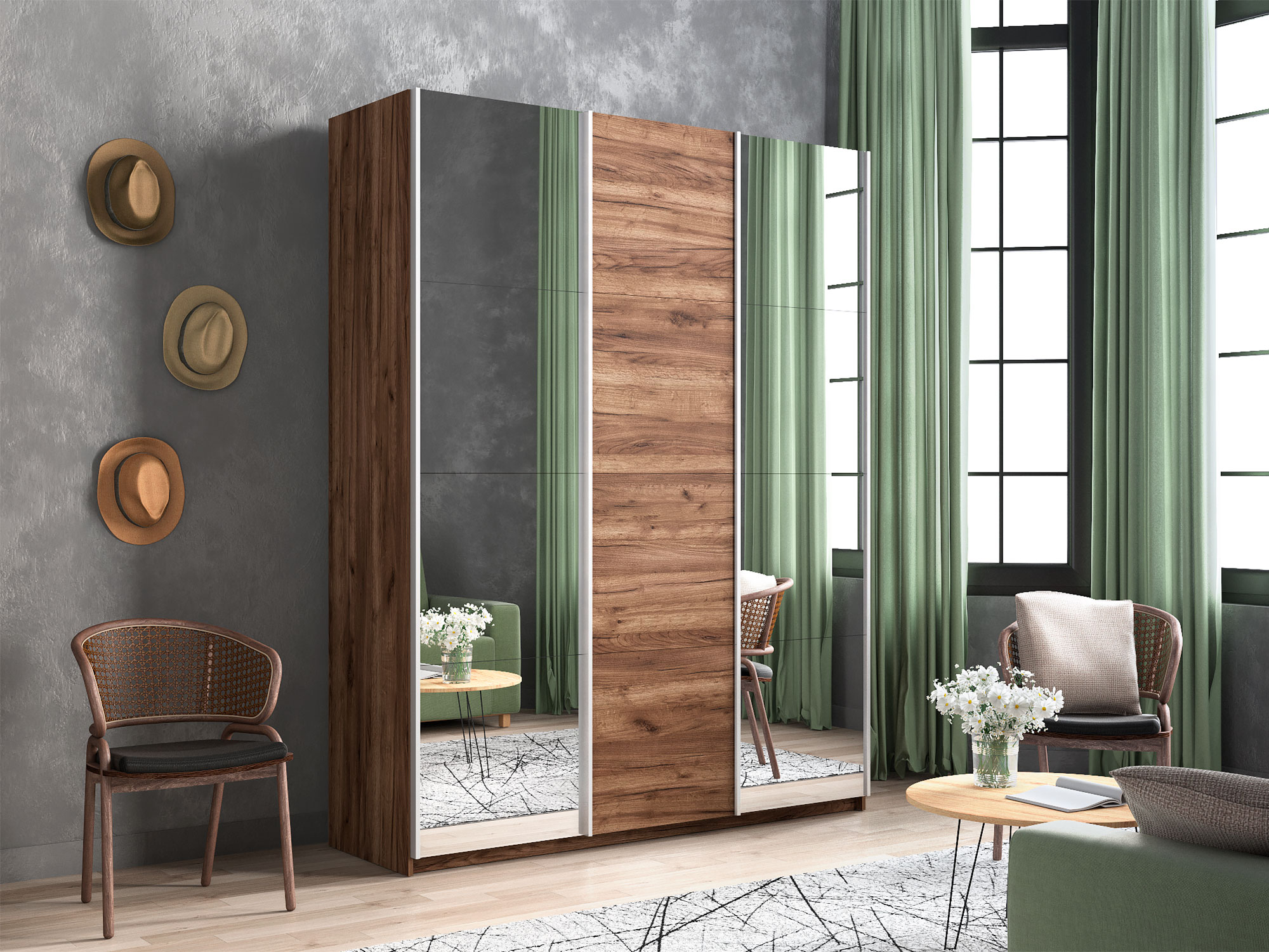- Шкаф-купе Прайм 3-х дверный 2100 два Зеркала/ДСП Крафт табачный