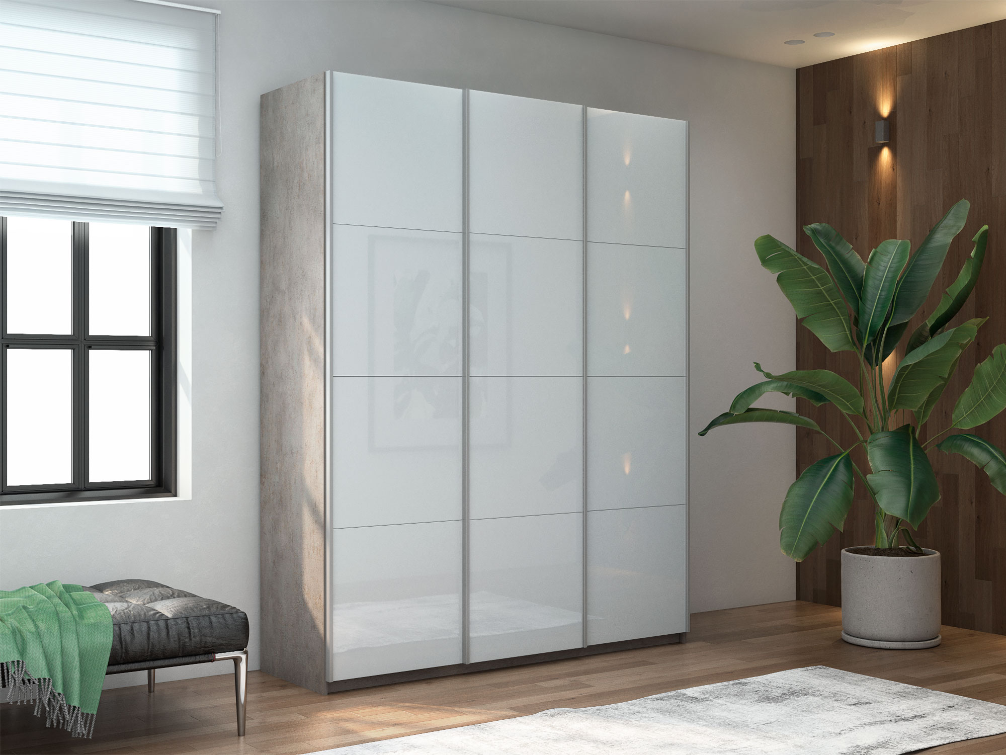 Шкаф-купе Прайм Широкий 3-х дверный три белых стекла Бетон