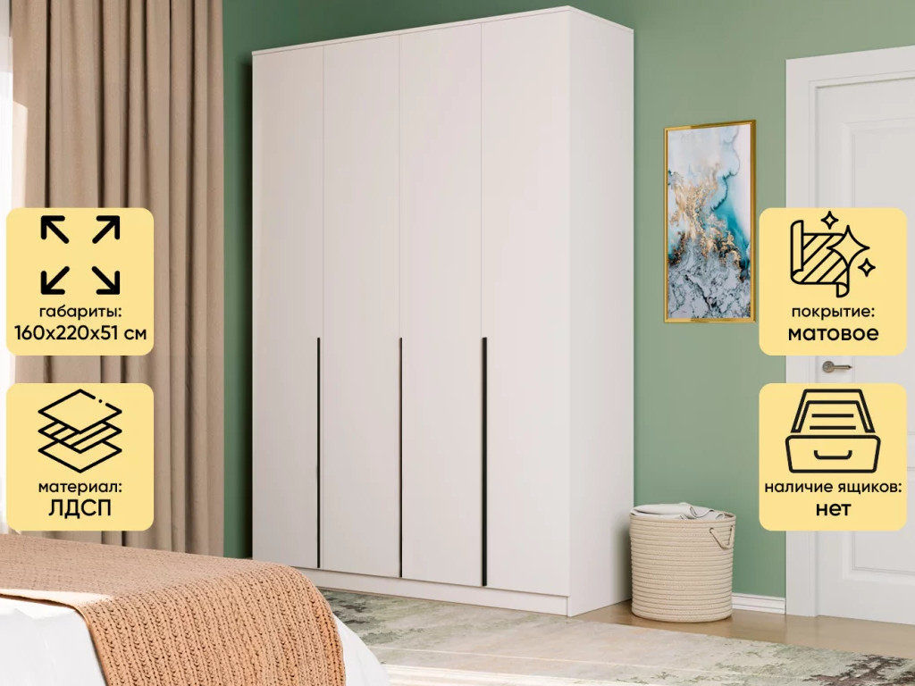 - Шкаф Монблан New распашной 1600 4-х дверный Белый Шагрень