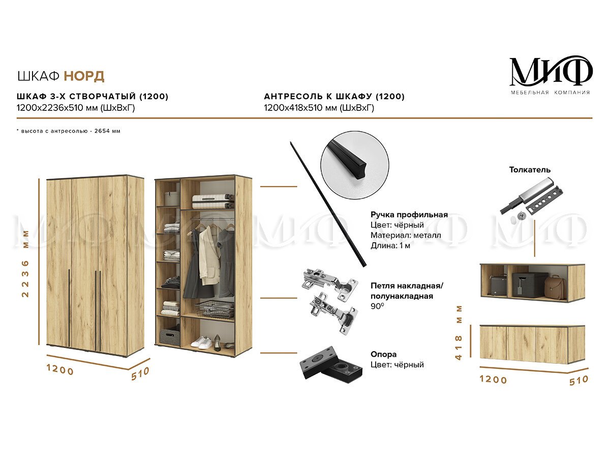 - Шкаф трехстворчатый Норд 1200 графит МГ