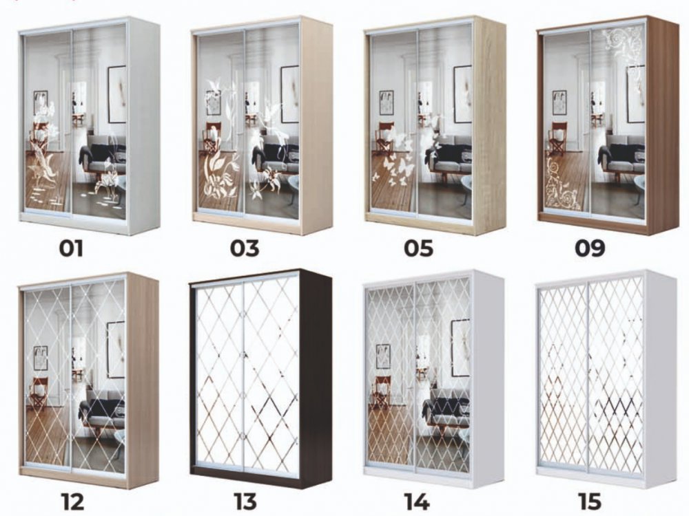 - 1 дверь Зеркало + 2 двери Зеркало с пескоструйной обработкой