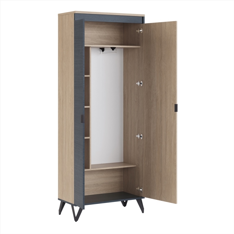 Возможна левосторонная и правосторонняя сборка.Толщина ЛДСП 16 мм. Ручки накладные (торцевые), также как и опоры изготовлены из металла, окрашенного полимерной антисколовой красной черного цвета. Шкаф универсальный  имеет два распашных фасада. Для крепления фасадов используются европейские четырехшарнирные петли фирмы Titus (Словения) с плавным закрыванием. Имеет три съемные полки. Комплектуется поперечной выдвижной штангой.