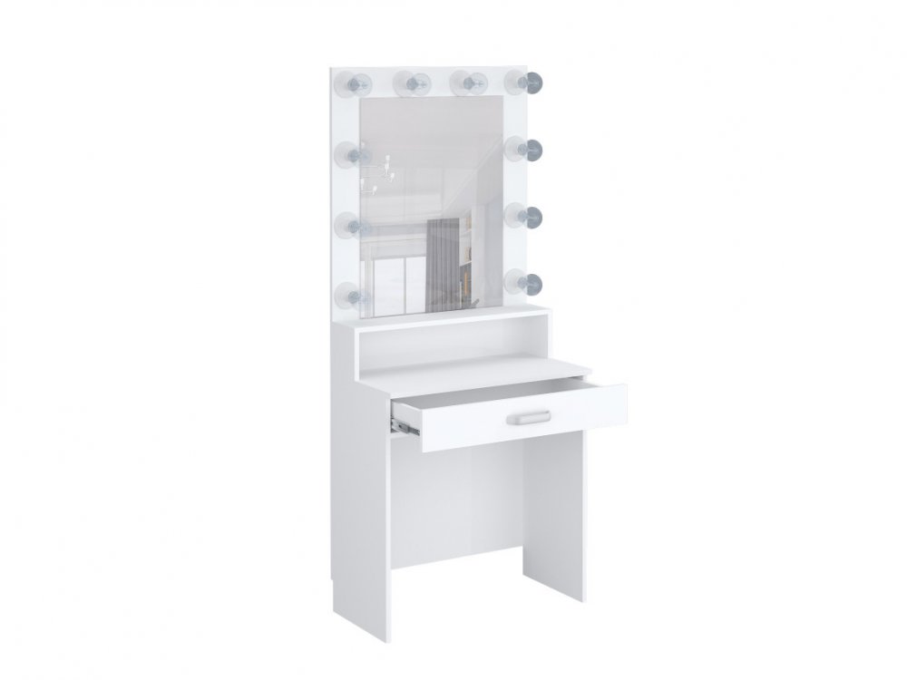 в конструкции столика есть выключатель для лампочек (лампочки в комплект не входят, так как подбираются индивидуально - в зависимости от необходимости по насыщенности и теплохолодности света), розетка, небольшая рабочая зона, полочка и выкатной ящик для косметики.